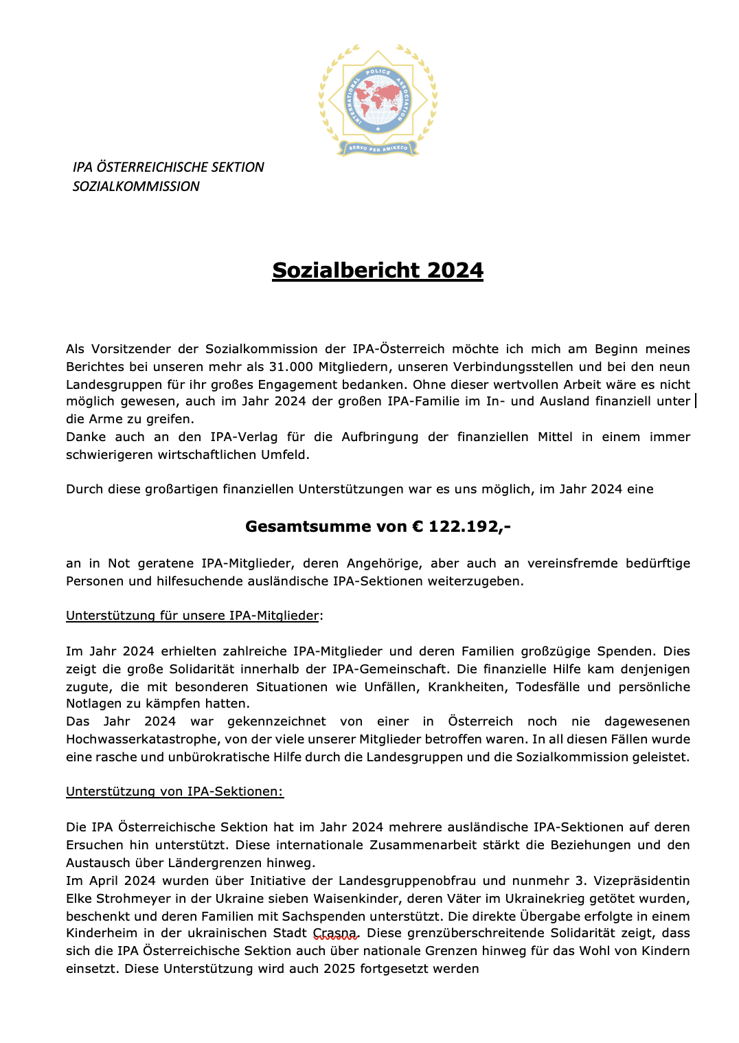 Die Sozialkommission der IPA Österreich bedankt sich aufrichtig und von ganzem Herzen für die im Jahr 2024 geleisteten Sozialspenden. Die beachtliche Summe zeugt wieder einmal von dem ungeheuren Engagement unserer Mitglieder, Verbindungsstellen und Landesgruppen, ohne deren wertvolle Arbeit es nicht möglich gewesen wäre, auch 2024 der großen IPA-Familie im In- und Ausland finanziell unter die Arme greifen zu können. Ein großes Dankeschön gilt außerdem dem IPA-Verlag, unserem verlässlichen Partner bei der Aufbringung der finanziellen Mittel für den sozialen Bereich.